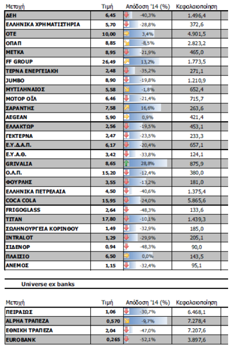 Η άνοδος της Παρασκευής ήταν η μεγαλύτερη των τελευταίων 26 μηνών για τον Γενικό Δείκτη, με την αμέσως μεγαλύτερη να έχει σημειωθεί στις 14/6/2012 (+10,12%). Τα κέρδη ήταν εντυπωσιακά για σειρά τίτλων και ξεχώρισαν οι ΟΤΕ (+12,87%), Folli Follie Group (+12,72%), Jumbo (+11,67%) ,Motor Oil (+11,38%), Μυτιληναίο (+11,16%), ΕΧΑΕ (+10,68%), ΟΠΑΠ (+10,63%), Aegean Airlines (10,49%) ΓΕΚΤΕΡΝΑ (+9,78%), MIG (+9,35%), Εθνική (+9,09%), πλην οι επιδόσεις των περισσότερων μετοχών από την αρχή του έτους δεν επιτρέπουν πανηγυρισμούς.